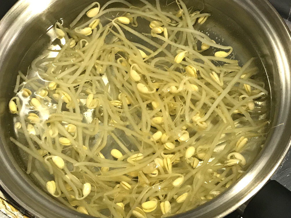 1、モヤシは適当に茹でる。