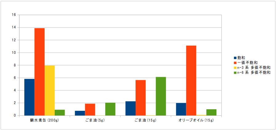 以下に、鯖缶、ごま油、そして対象油としてオリーブオイルの脂肪酸組成を示します。