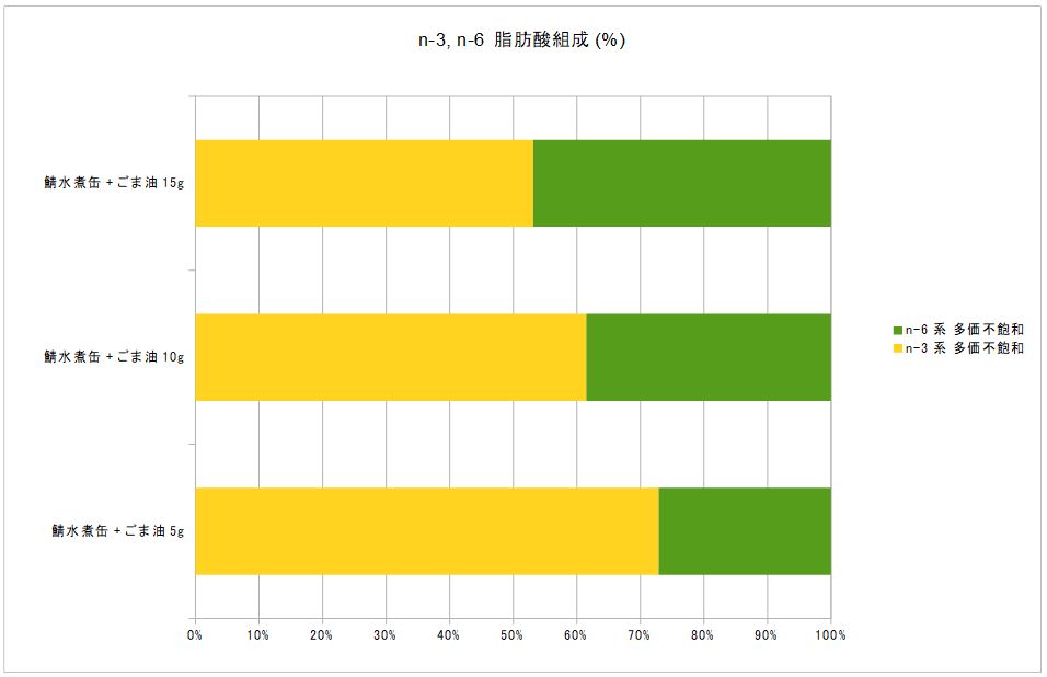 以下に、鯖水煮缶1個と、ごま油各量を使用したときの脂肪酸組成と、ω3/ω6比率を示します。