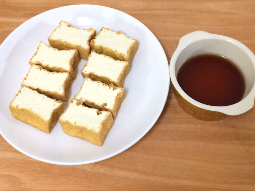 1、厚揚げを適当な大きさにスライスする。