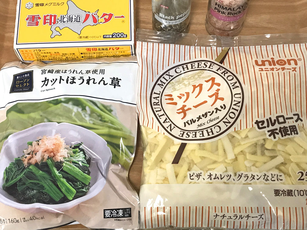冷凍ほうれん草とピザ用チーズを使ったお手軽レシピです。