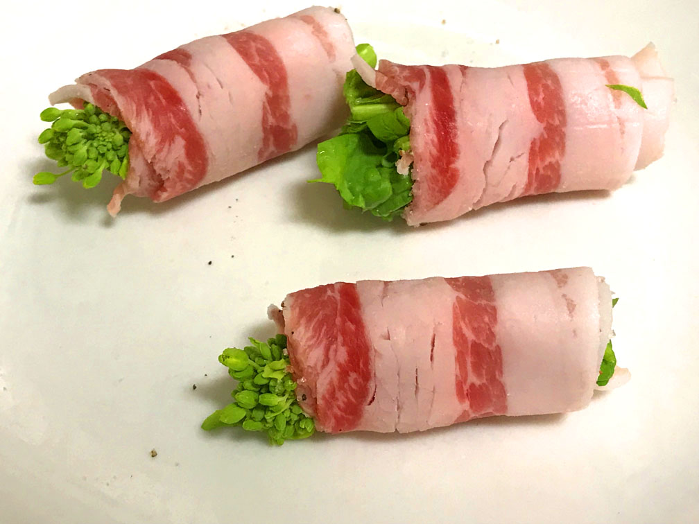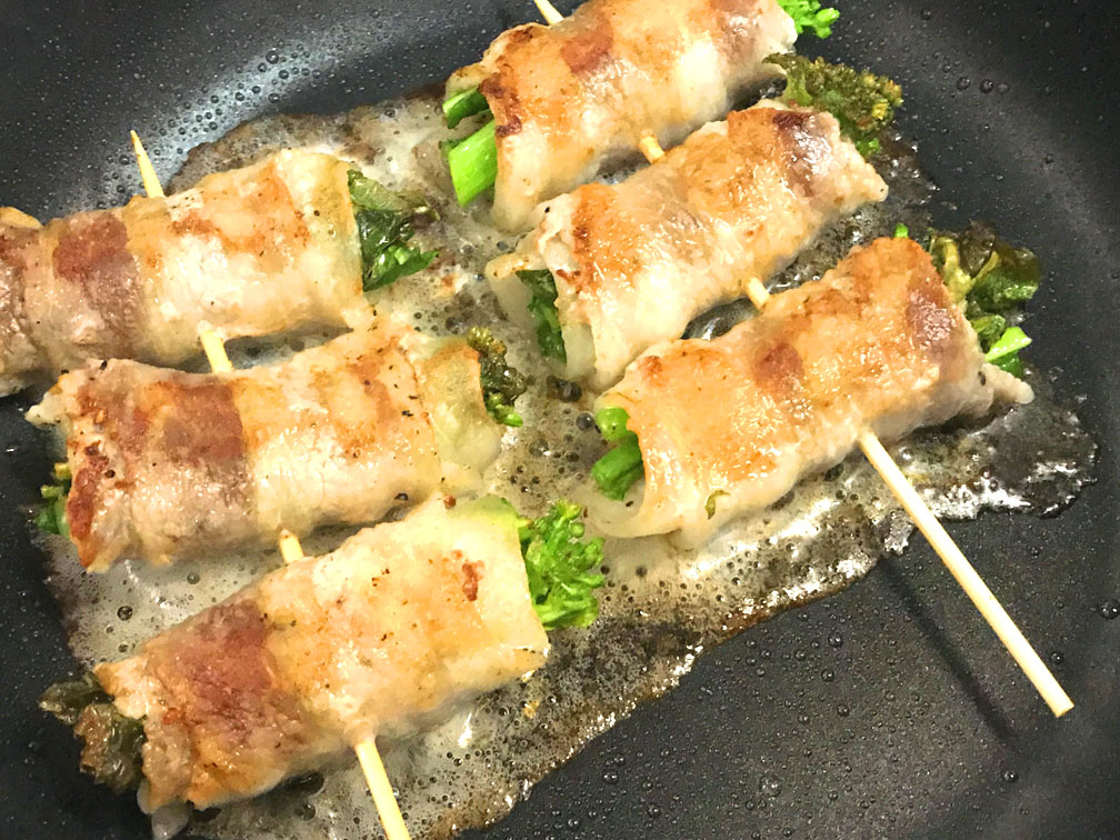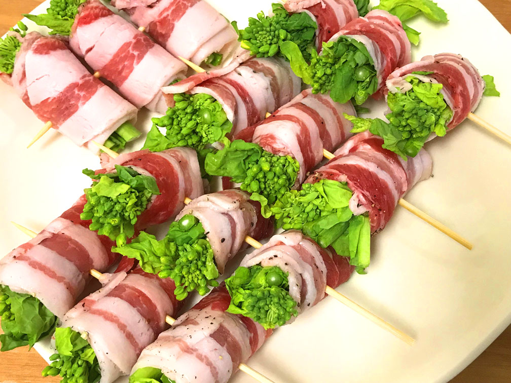春の味覚を豚バラで巻いて焼くだけのシンプルな料理です。