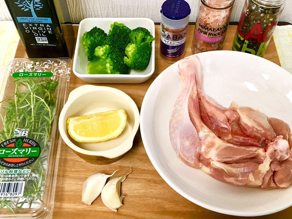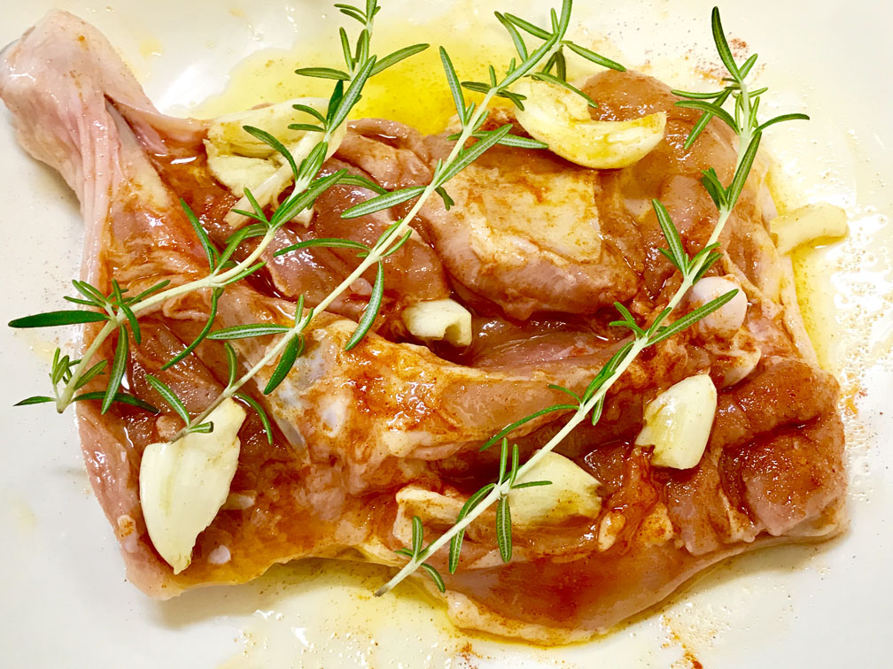 カイエンペッパー・潰したニンニク・ローズマリー・そしてオリーブオイルを塗り込み、1時間以上寝かせます。