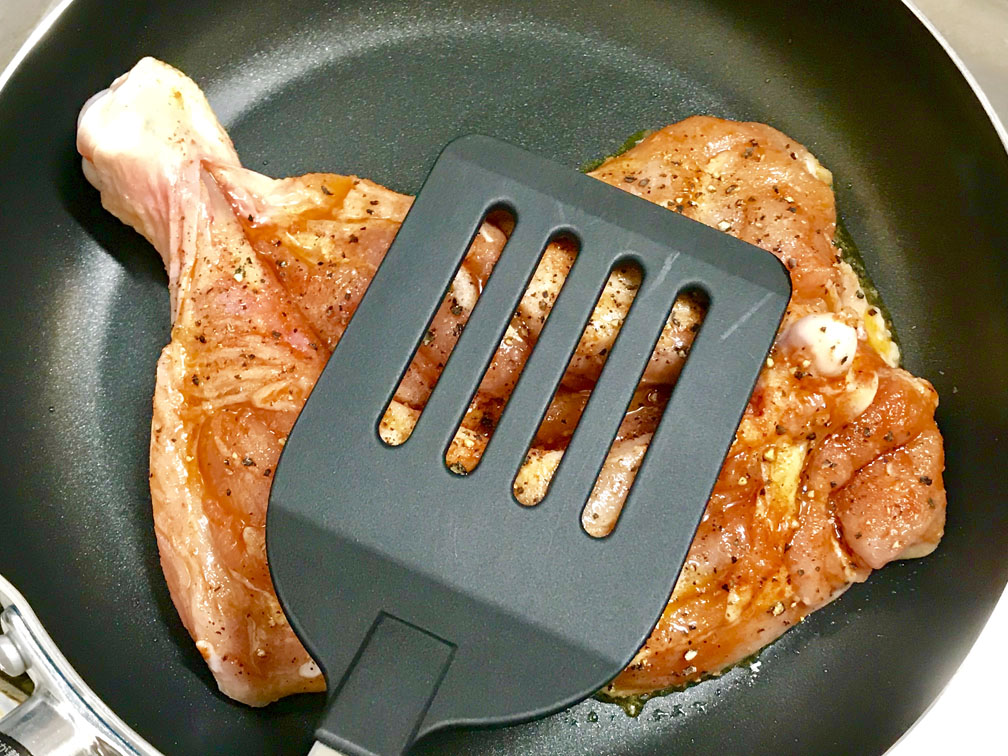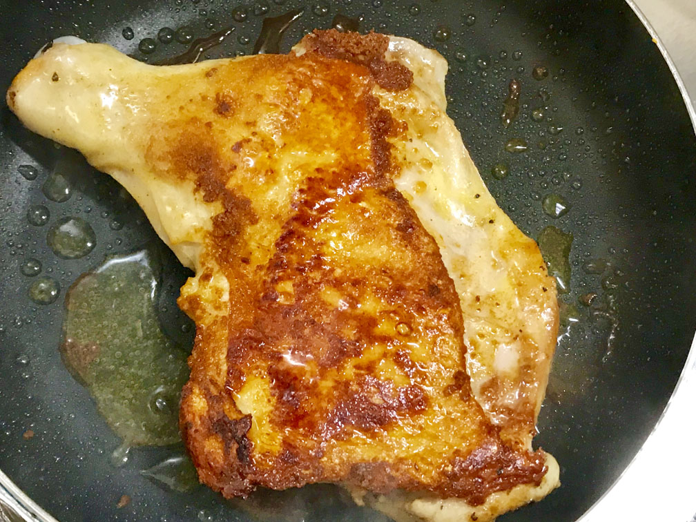 マリネの油が付いた状態で、皮を下にして焼きます。弱火~弱めの中火でフタして8分くらいです。