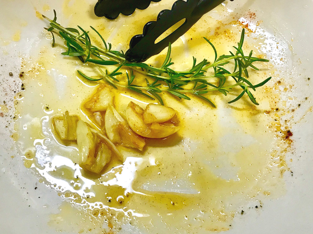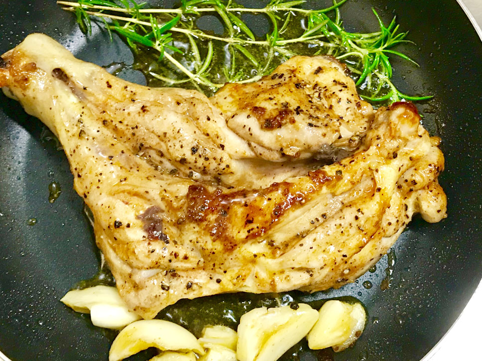 マリネに使用したオリーブオイル・ニンニク・ローズマリーを入れて、強火で皮をカリッと仕上げます。