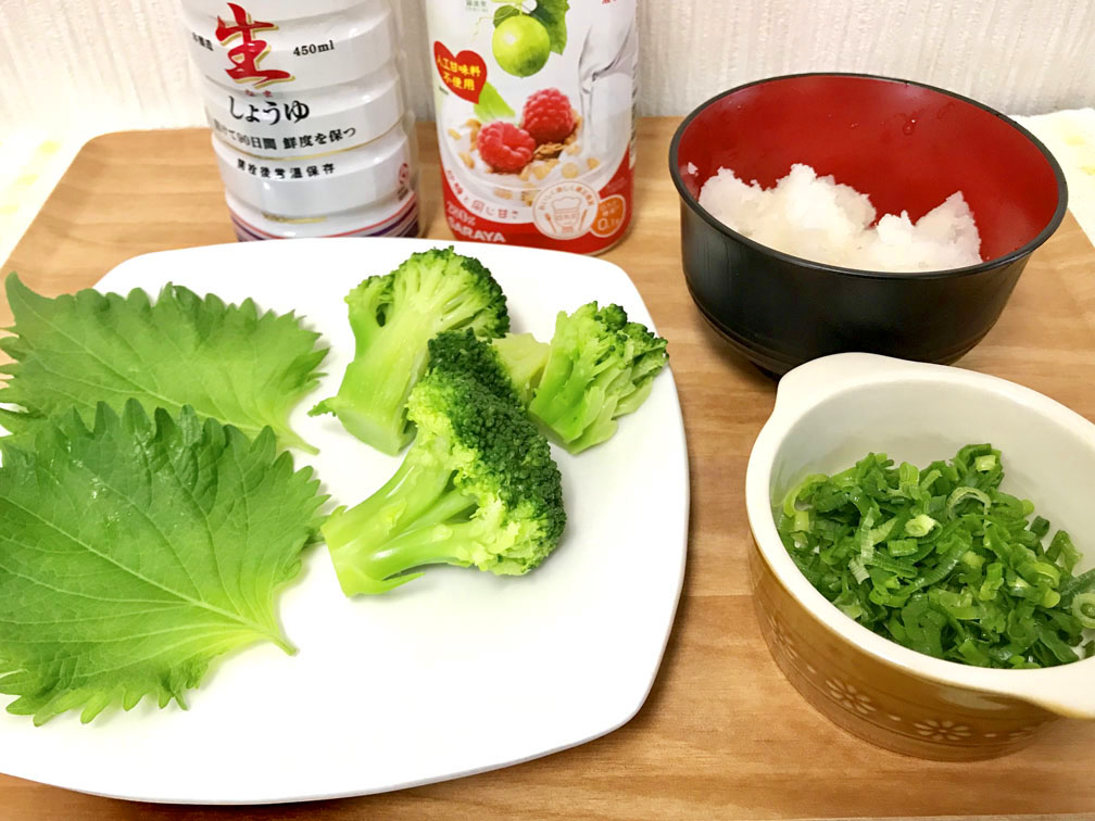 ラカント照り焼きソースと共に、大葉・大根おろし・小ネギで和風感を出してみました。