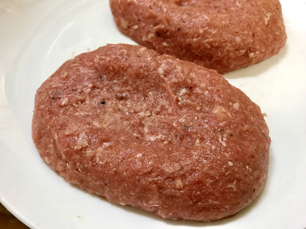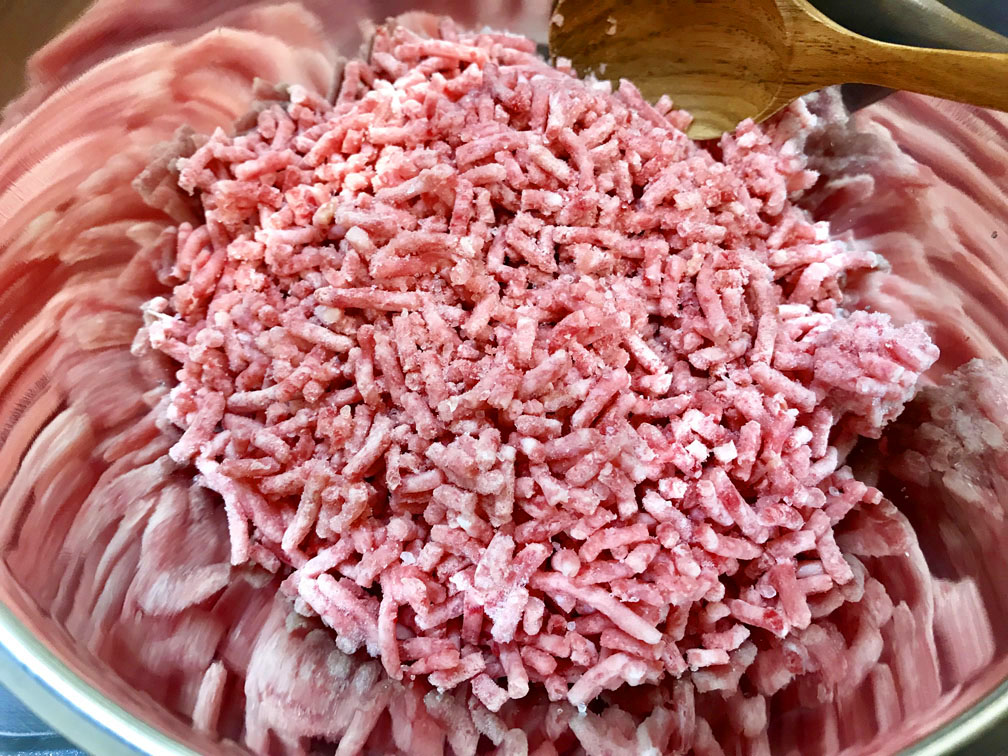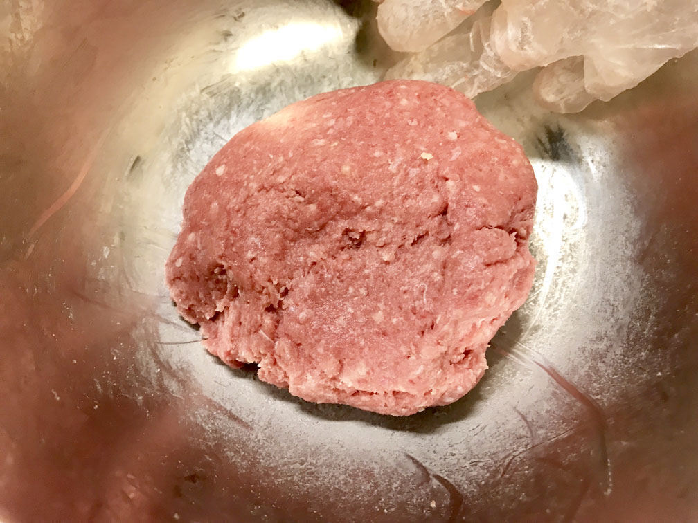 1、合いびき肉を塩だけでこねます。