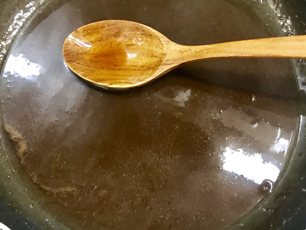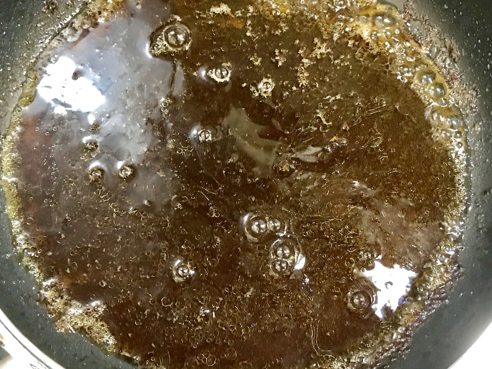 フライパンにソースの材料を入れて、体積が半分になるまで煮詰めます。