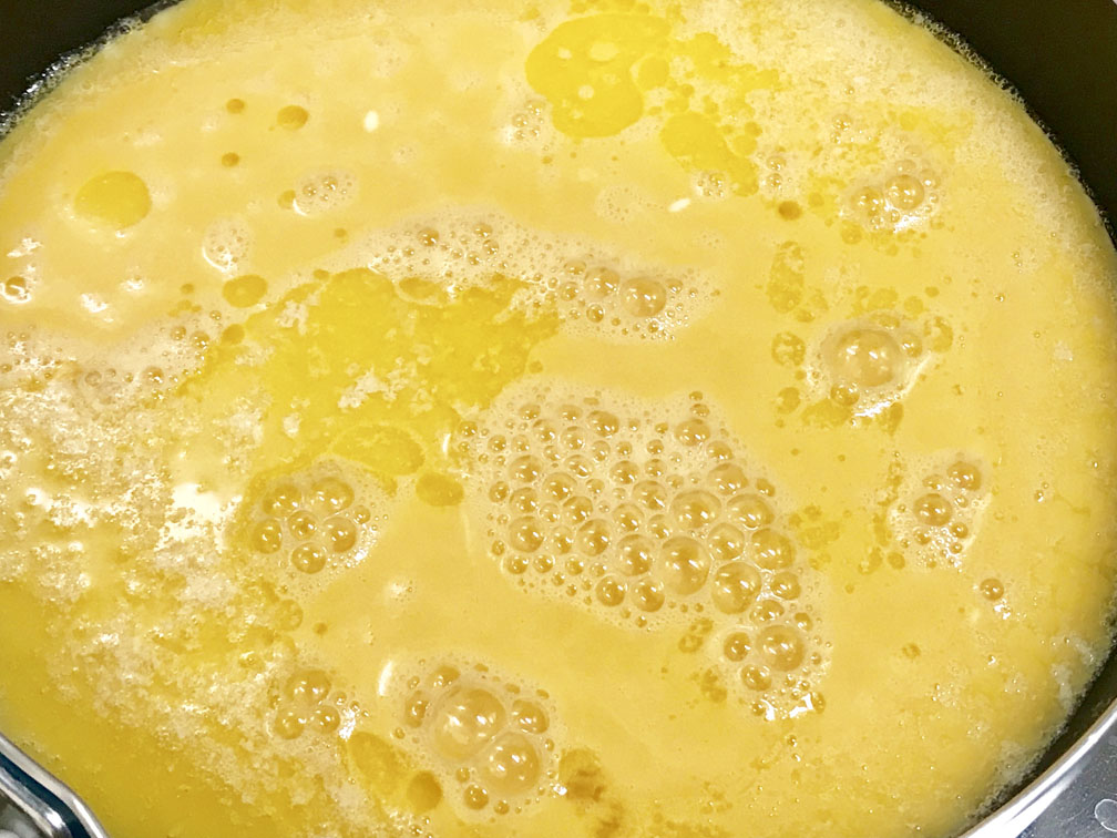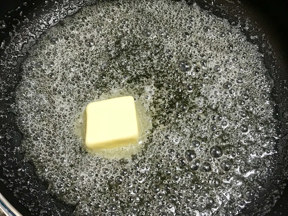 フライパンにバターを落として、スクランブルエッグを作ります。