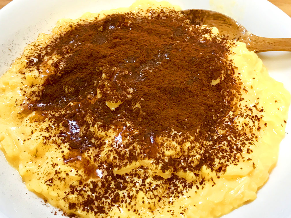 3、シロップとココアパウダーを振りかけて完成