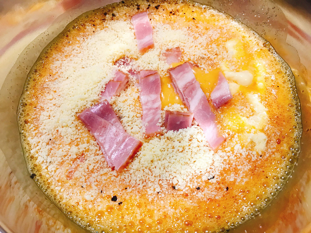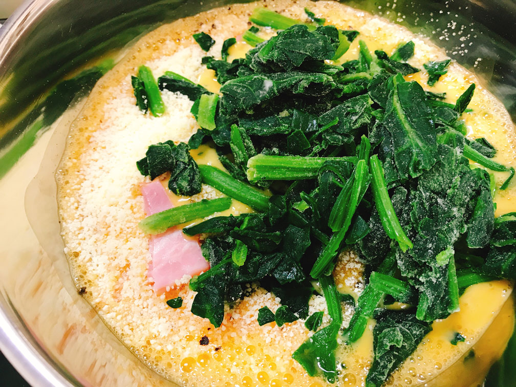 例えば、野菜なら刻んだブロッコリーやアスパラガス、スライスした玉ねぎなど。肉類は、ベーコンを入れる人が多いですが、ひき肉や刻んだサラミを入れるレシピもあります。キノコであれば、スライスしたマッシュルームが合うと思います。