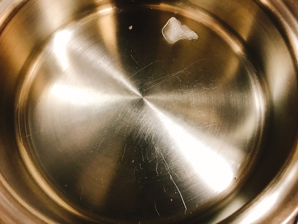 温めたフライパンにココナッツオイルを入れ、フタして弱火で15分焼きます。