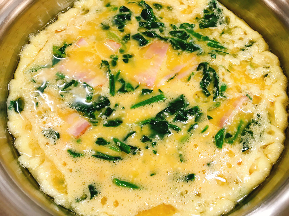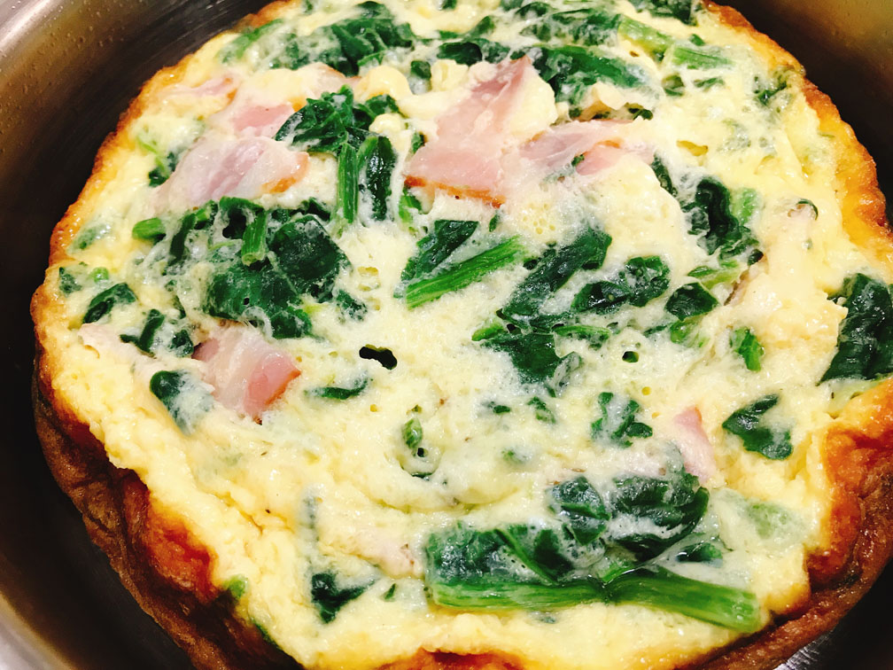 卵と生クリームを使って作るフランス、アルザス=ロレーヌ地方の郷土料理……の糖質カットバージョンです。実体としては『パイ生地・タルト生地が無い具だくさんの卵焼き』なので、身近な材料だけで手軽に作ることができます。