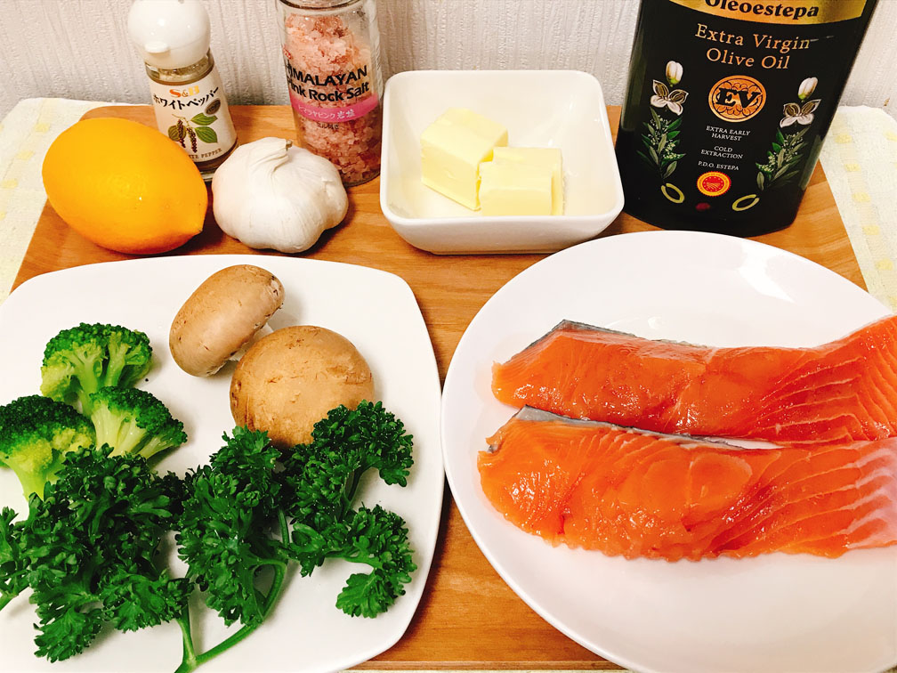 1、レモン・パセリ・ニンニク・鮭の下拵えをします。