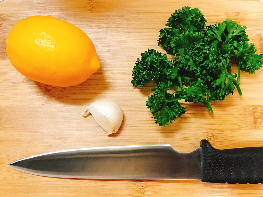 レモンは半分にして飾り用に1枚だけスライス、パセリとニンニクはみじん切りにります。