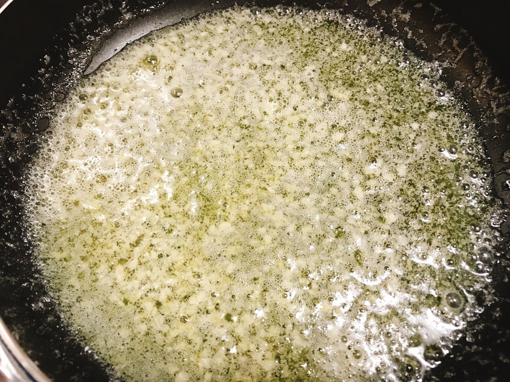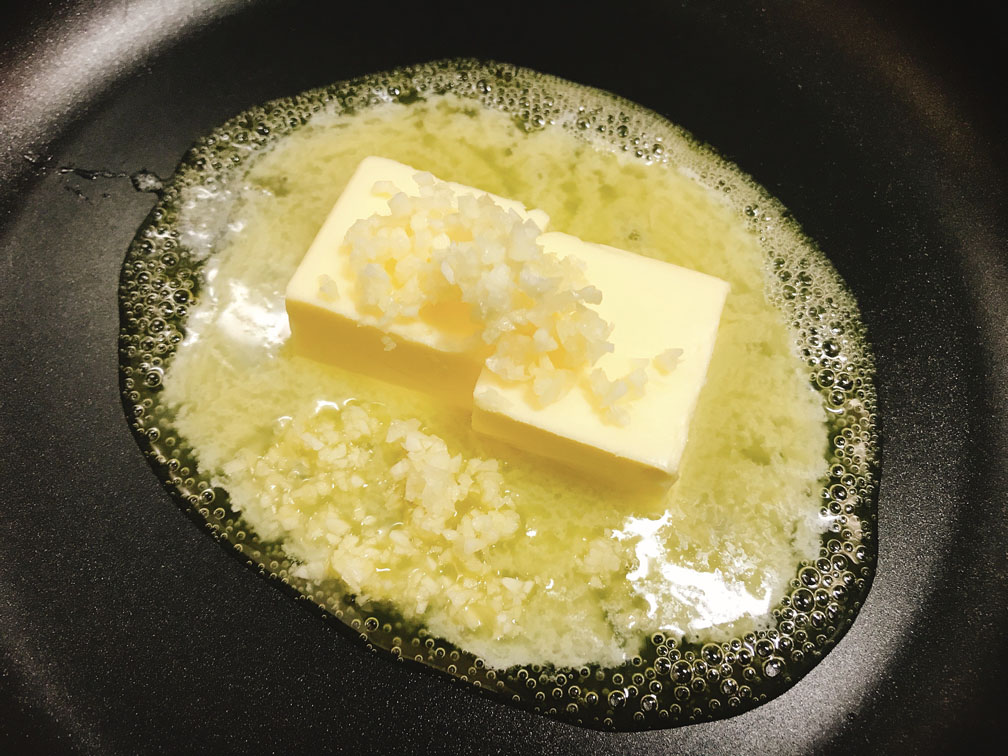 フライパンにバターとニンニクを入れ、弱火でじっくり香りを引き出します。