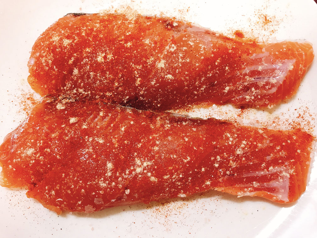 鮭は岩塩・白コショウ・カイエンペッパーを振りかけます。