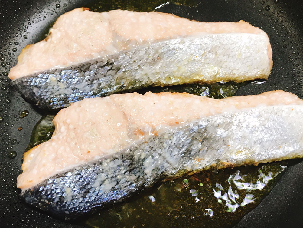 弱火でフタして3.5分。ひっくり返して3分程度です。(身の厚さによって焼き時間が若干変化します)