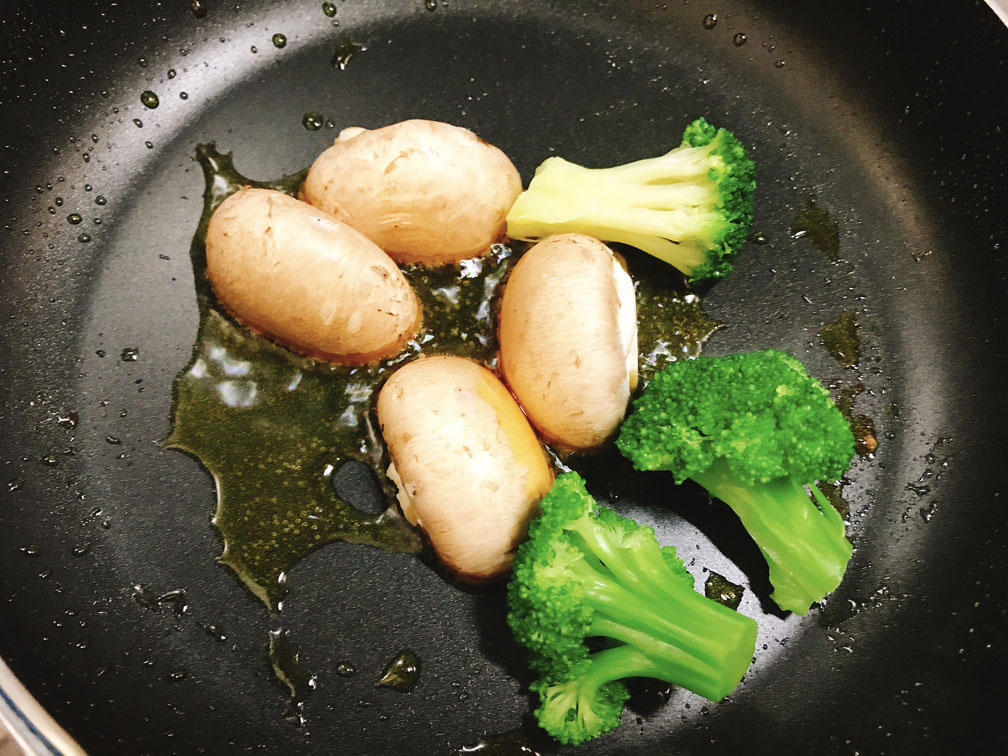 残った油で付け合わせをさっと炒めて岩塩を振ります。