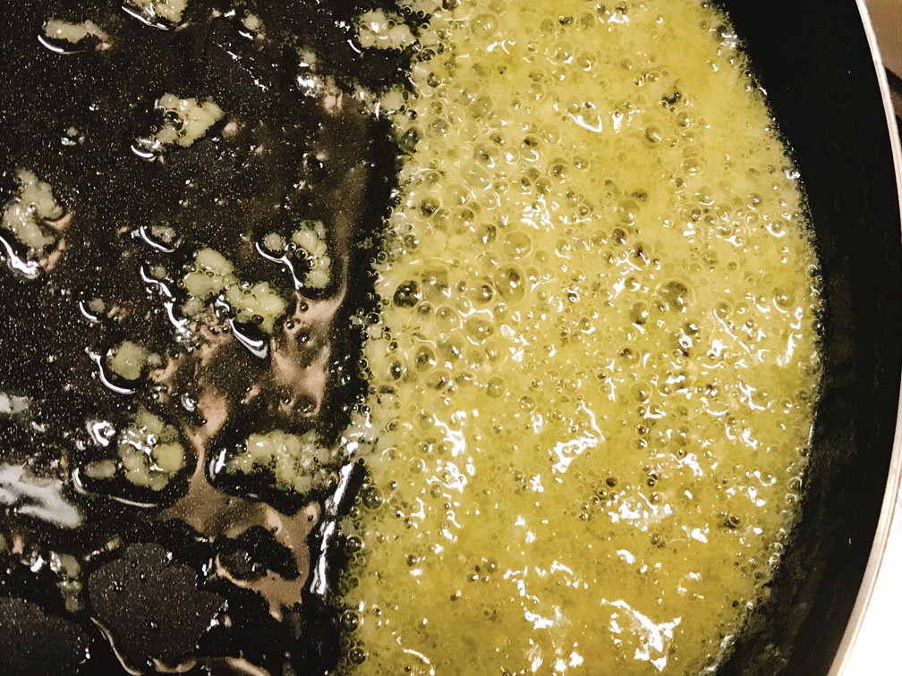 ニンニクの良い香りがしてきたらレモンを絞り、少し煮詰めます。