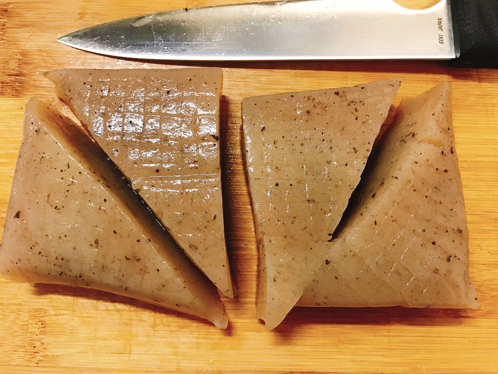 すりおろしたコンニャクイモから作る。コスパが悪く入手時期が限られてしまうが、凝固剤の量が少なくて済むので、食感が柔らかくもちもちしている。