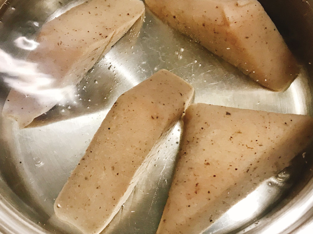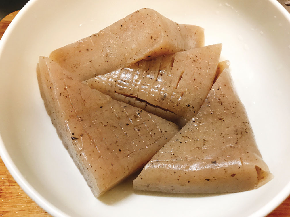 こんにゃくに隠し包丁(格子状に切れ目)を入れて味を染み込みやすくし、手ごろな大きさにカットした後、3分~5分茹でて臭みを取ります。