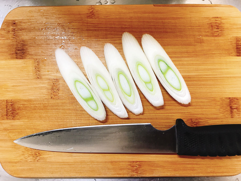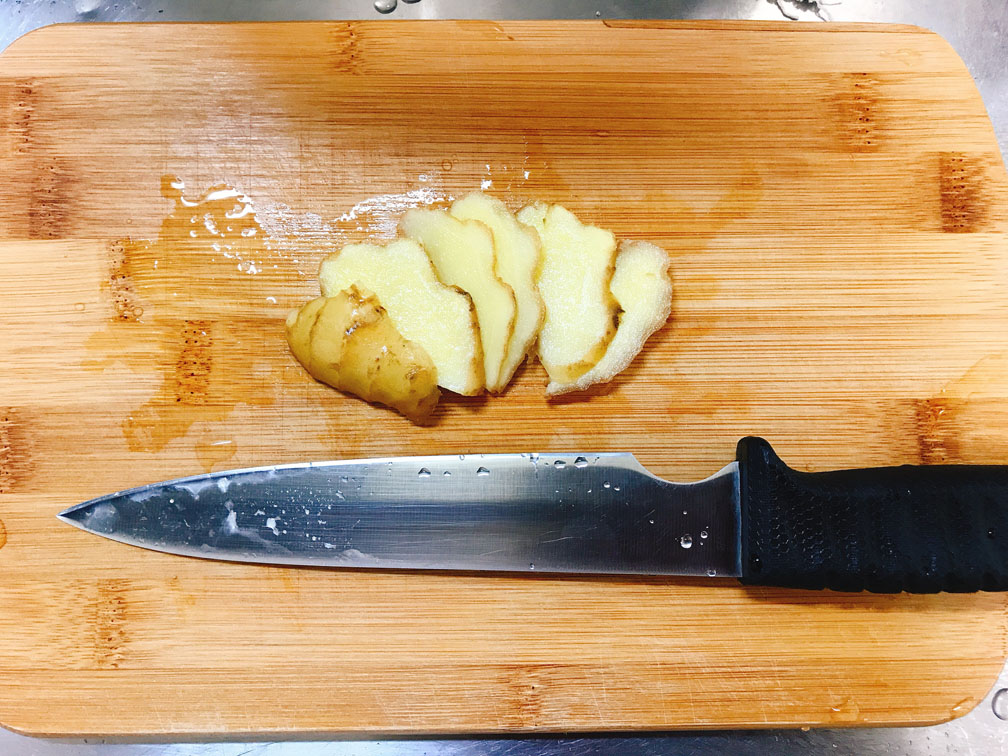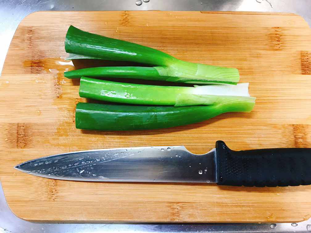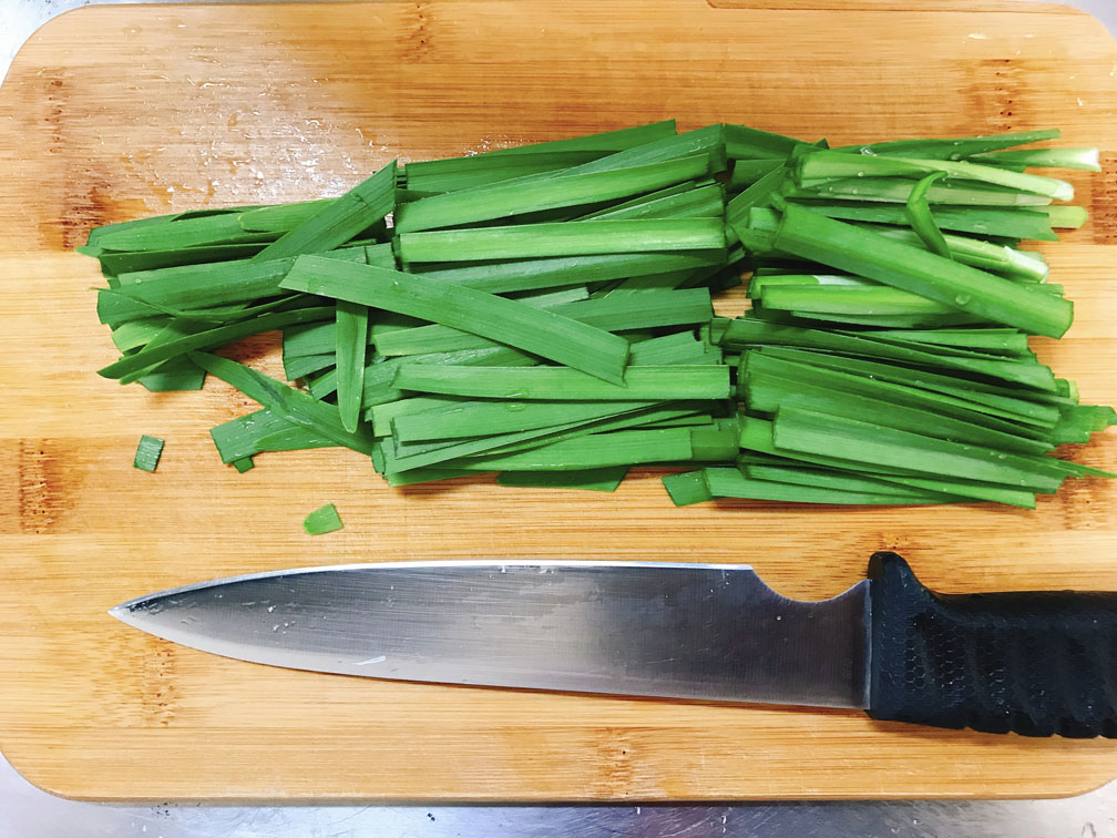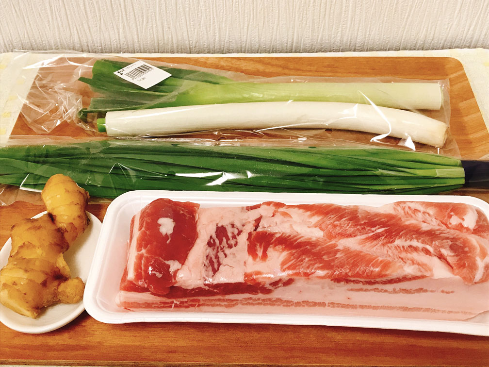 生姜、ネギ(青い部分と白い部分)、ニラを切ります。
