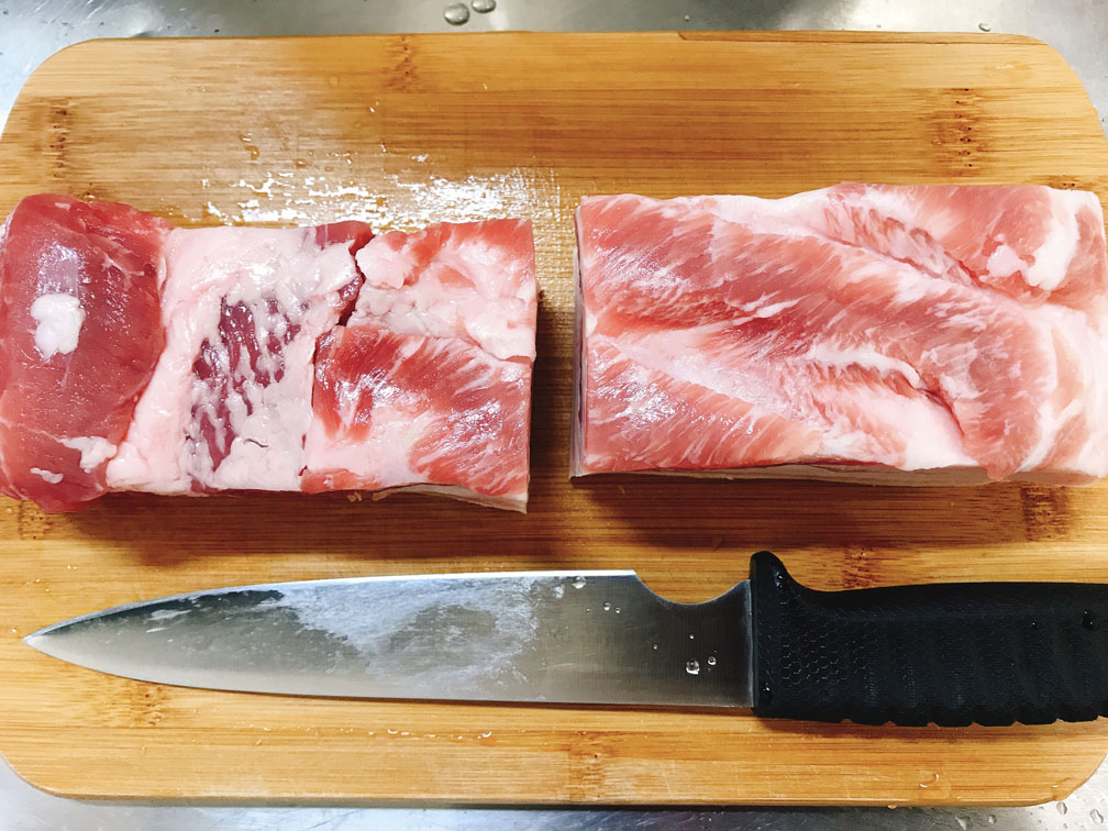 豚バラブロックは半分に切ります。(そうしないと鍋に入らないので…)