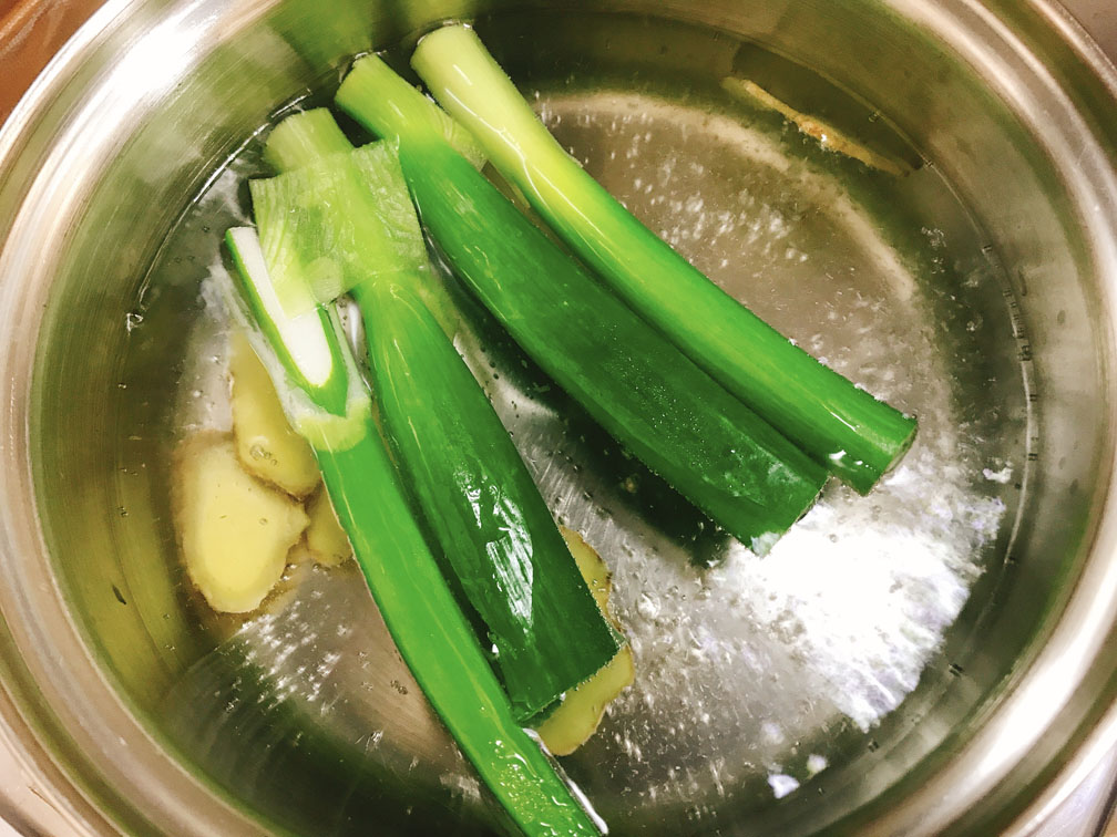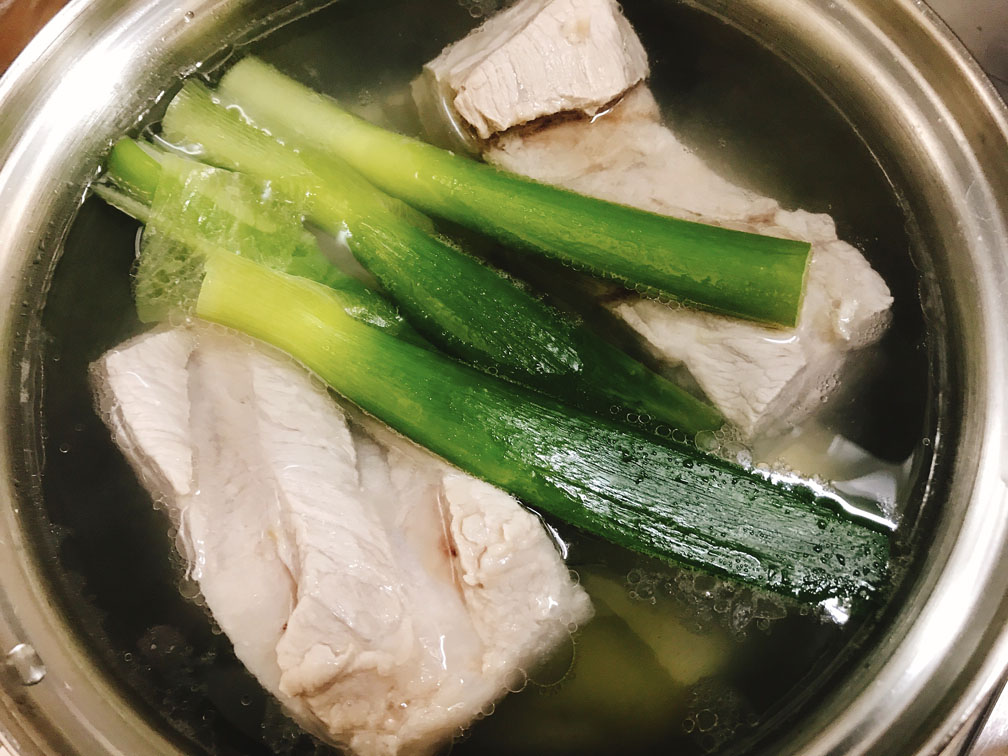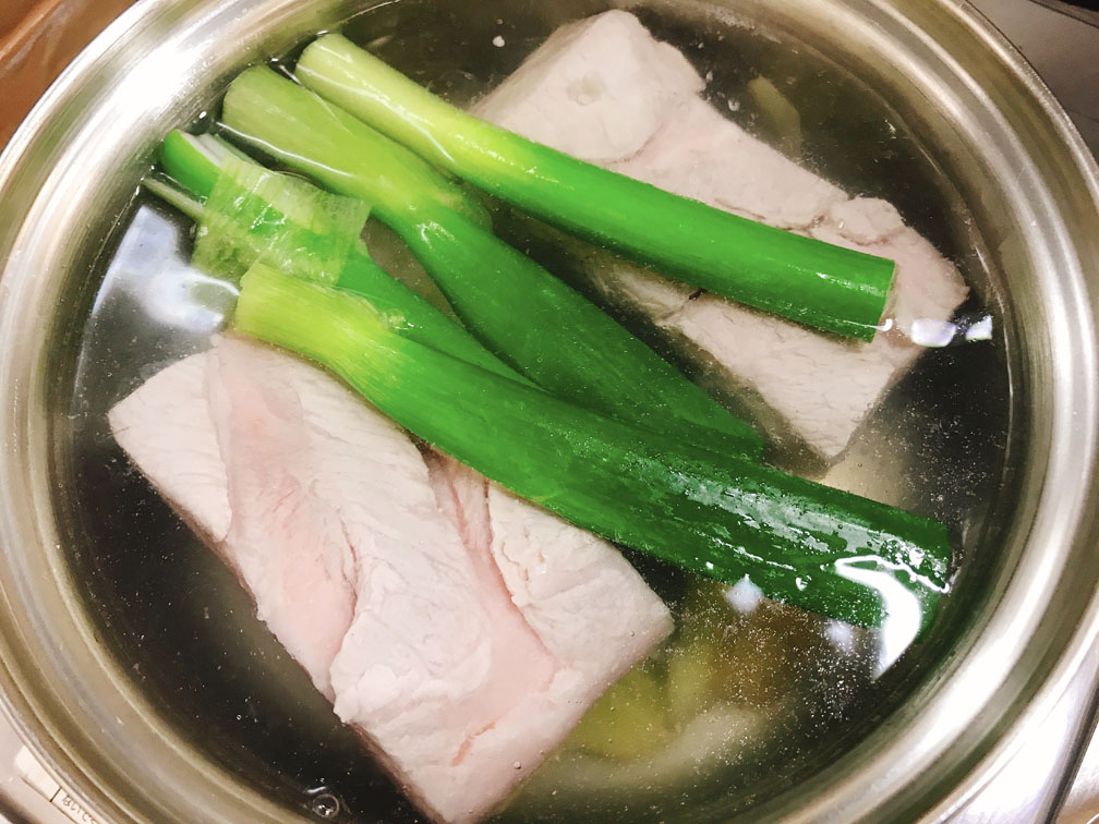 鍋にお湯を沸かし、お酒・生姜・ネギ(青い部分)・肉を入れます。
