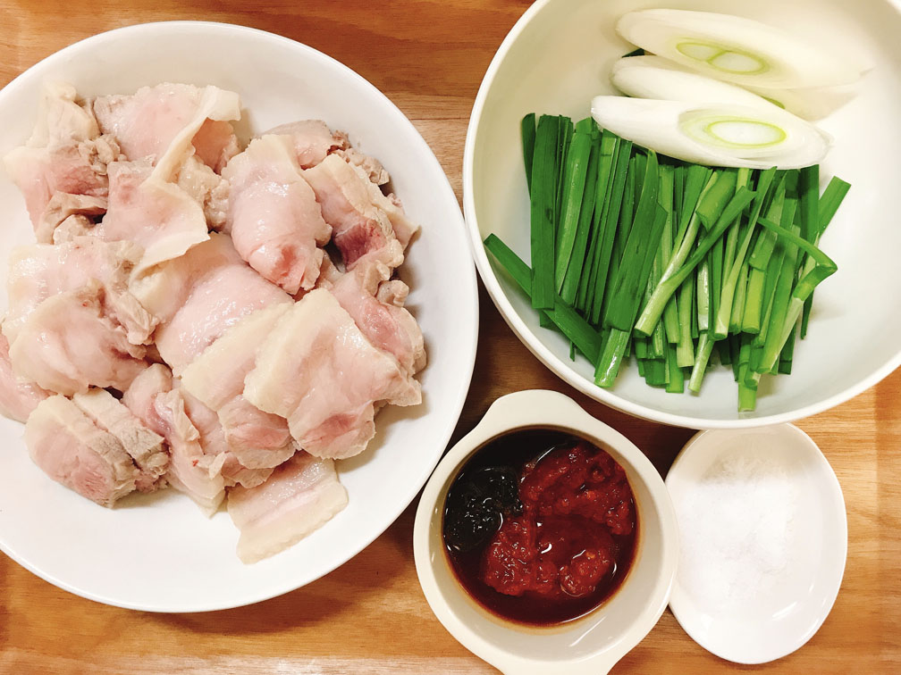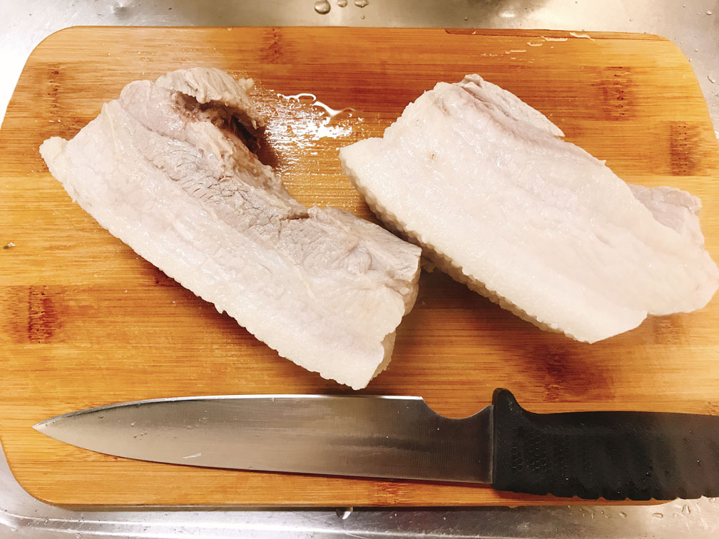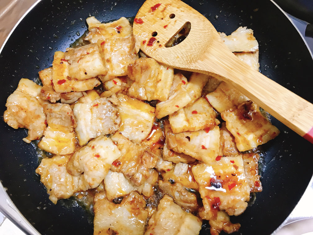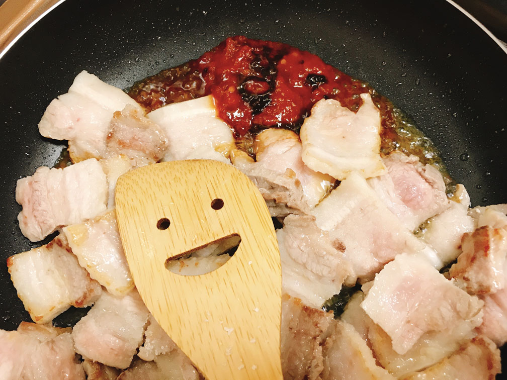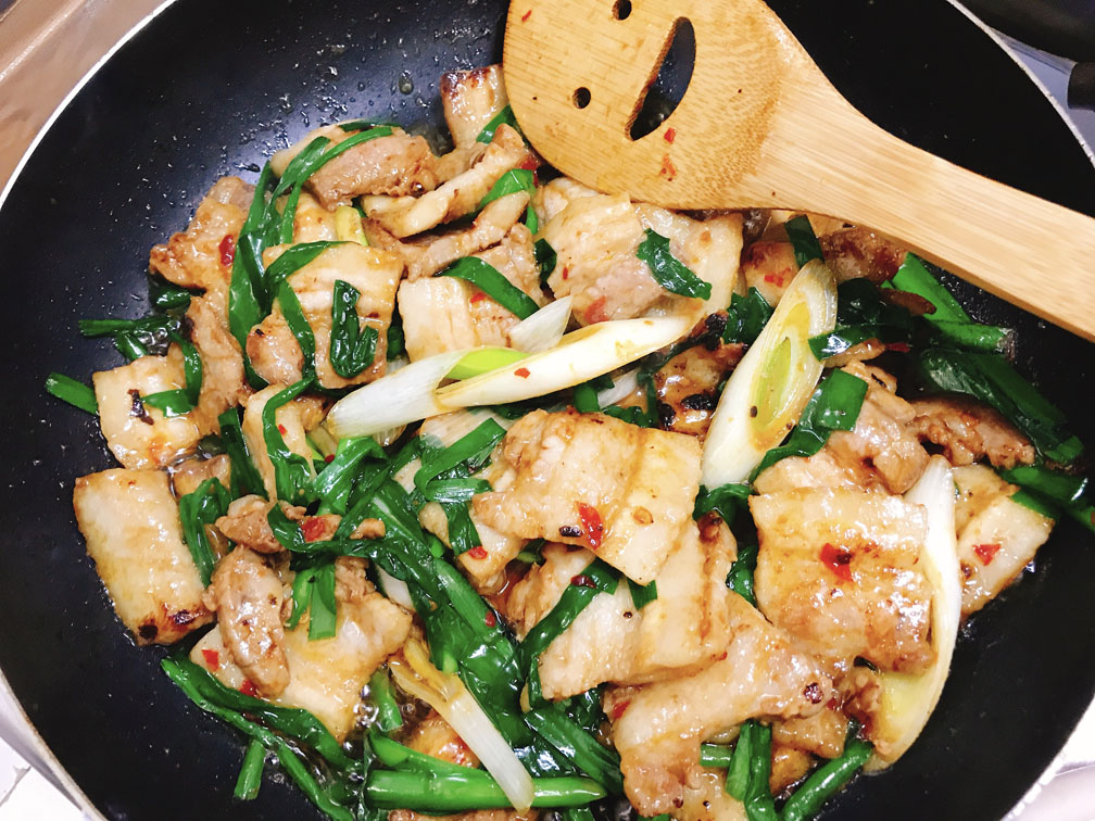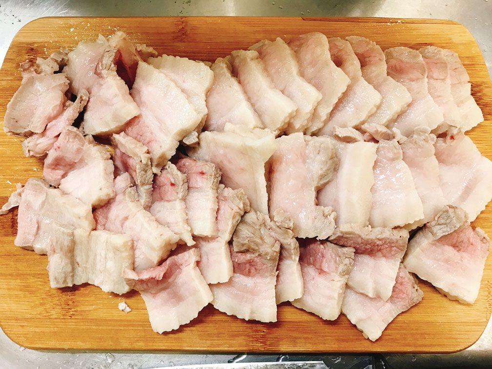 一旦豚バラを茹でて臭みをとり、その後で炒めを行うという調理手順から「回鍋肉(茹でた肉がまた鍋に戻ってくる)」という名が付いています。