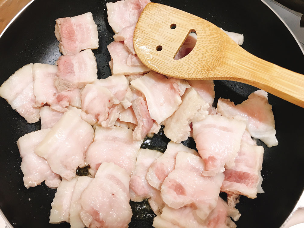 フライパンにごま油を敷き、豚バラを炒めて調味料を絡めます。