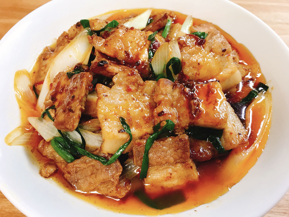 日本風にアレンジされた甘口・キャベツ入りの回鍋肉ではなく、お肉が主役の辛口の回鍋肉です。豚バラブロックを丸ごと1本使うレシピなのでボリュームの割にはコスパが良い一品です。
