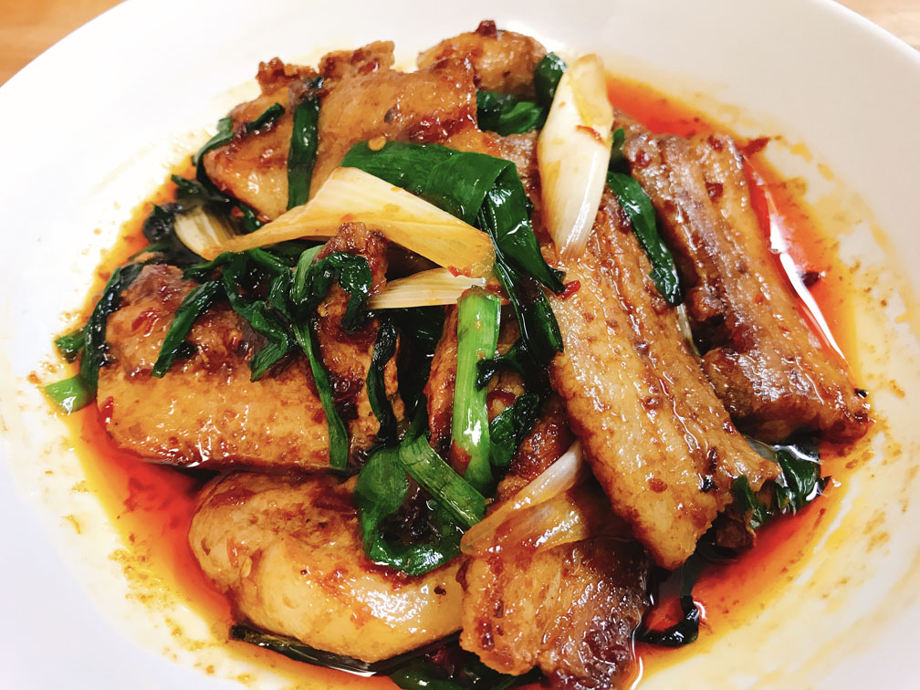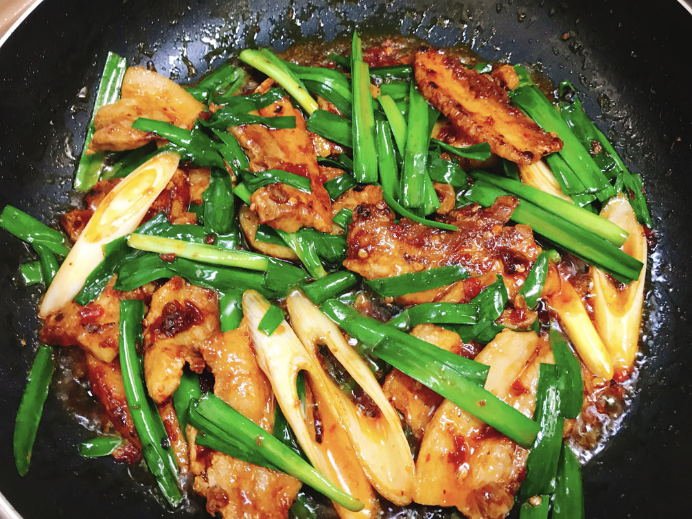 <四川式>:豆板醤を使った辛口みそ炒め。葉ニンニクが入っているが、主役はあくまで豚肉。