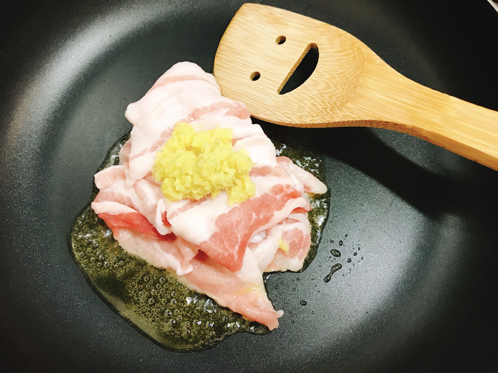 フライパンにごま油を敷き、豚バラと生姜を入れて炒めます。