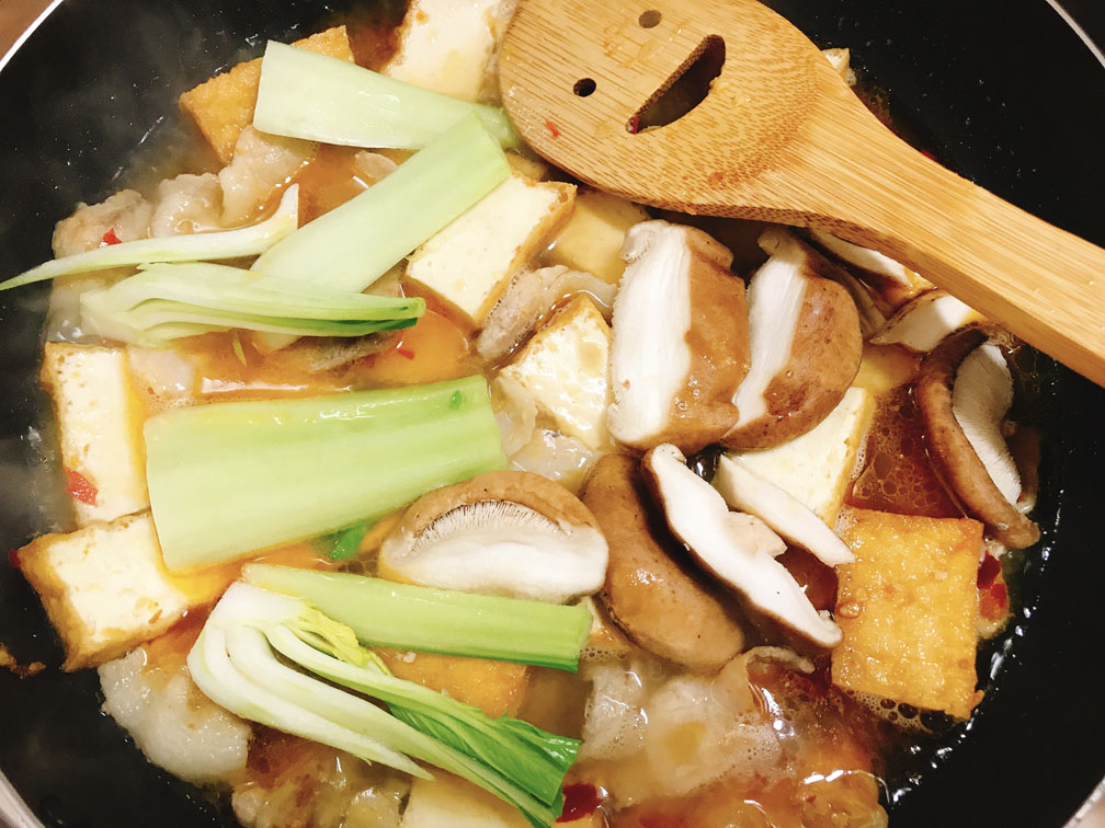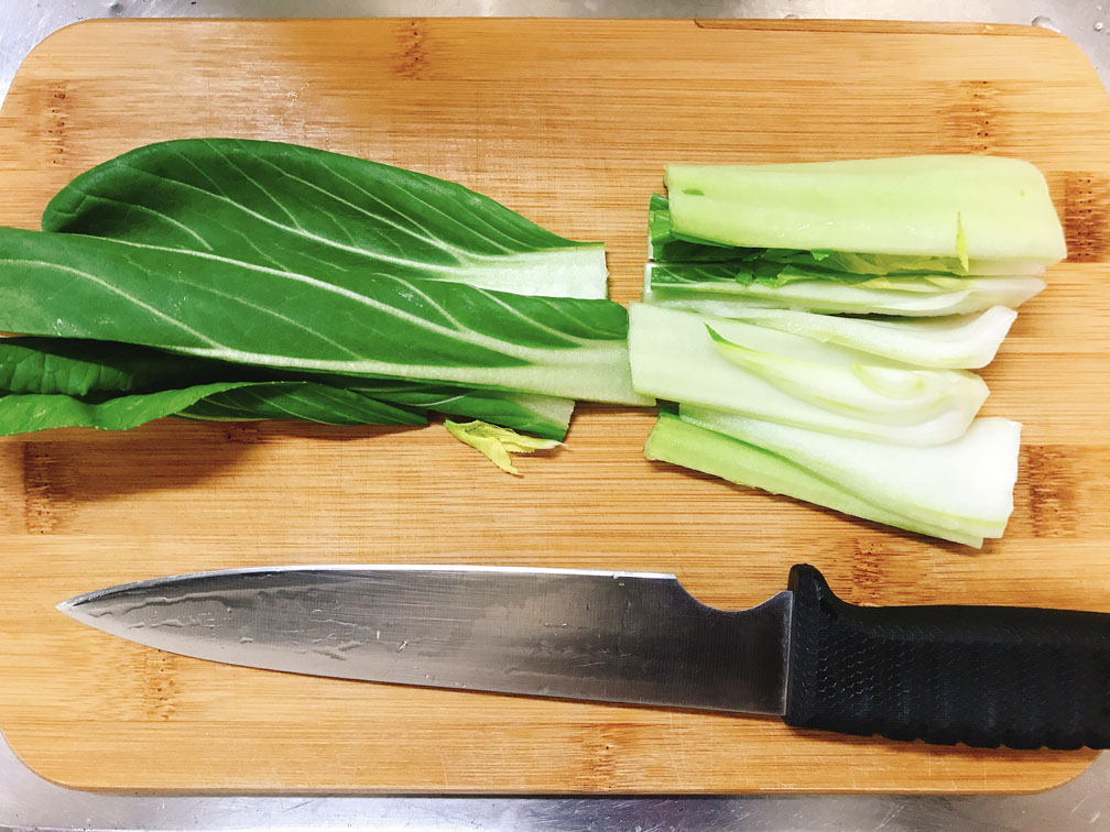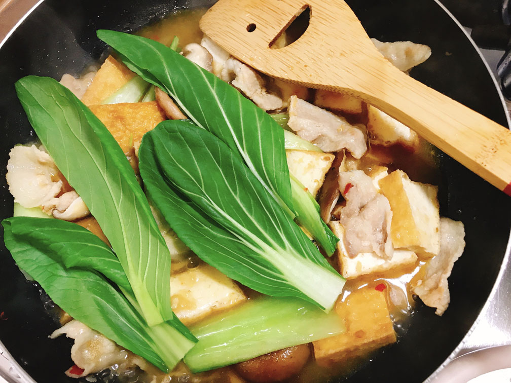 煮汁が沸騰してきたら、チンゲン菜の茎と椎茸を入れて、数分間炒め煮にします。