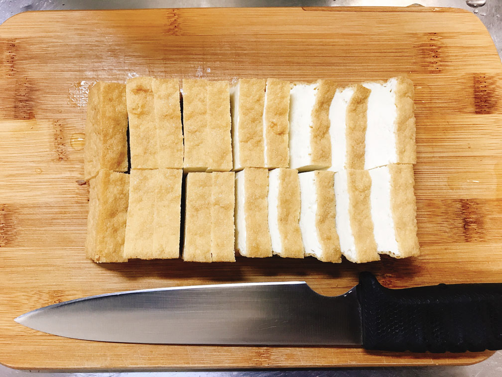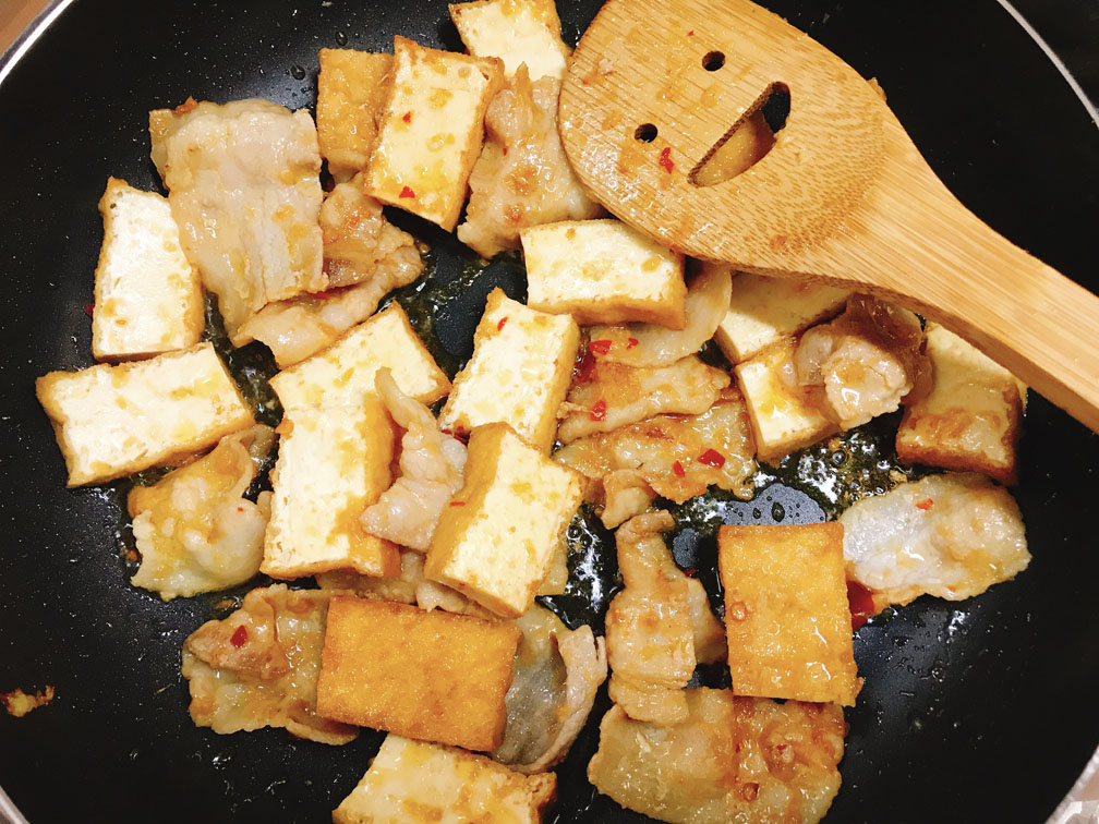 肉に火が通ったら、豆板醤&醤油&糖質0清酒を入れ、厚揚げを入れて2分くらい炒めます。