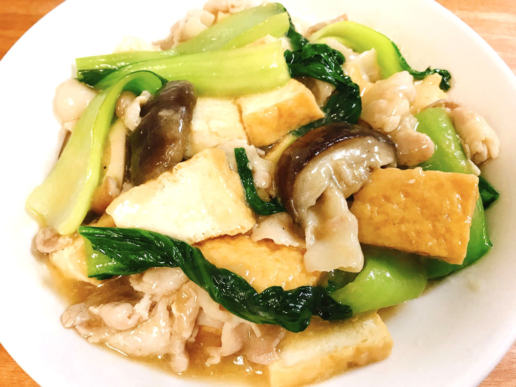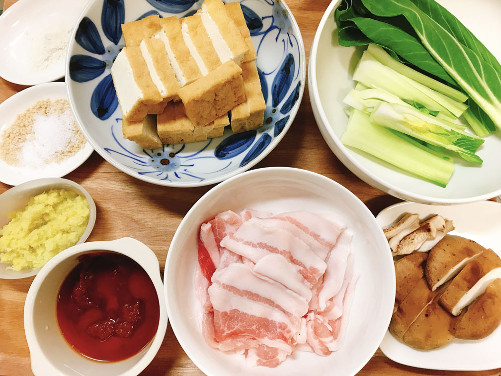 生姜は擦り下ろし、チンゲン菜・椎茸・厚揚げ・豚バラを適当な大きさに切ります。