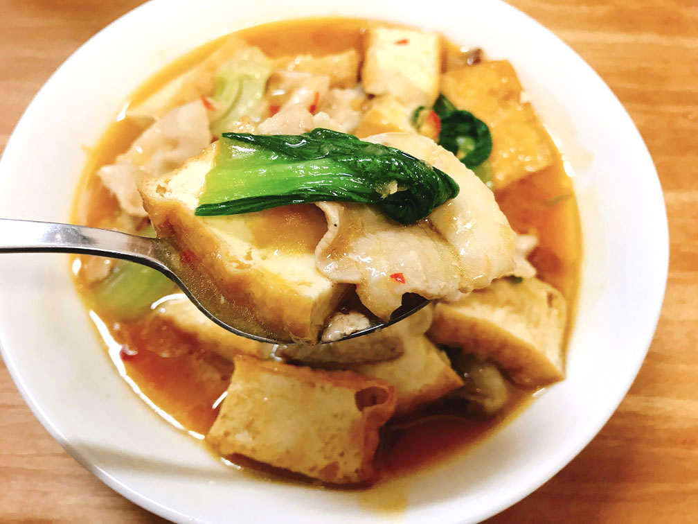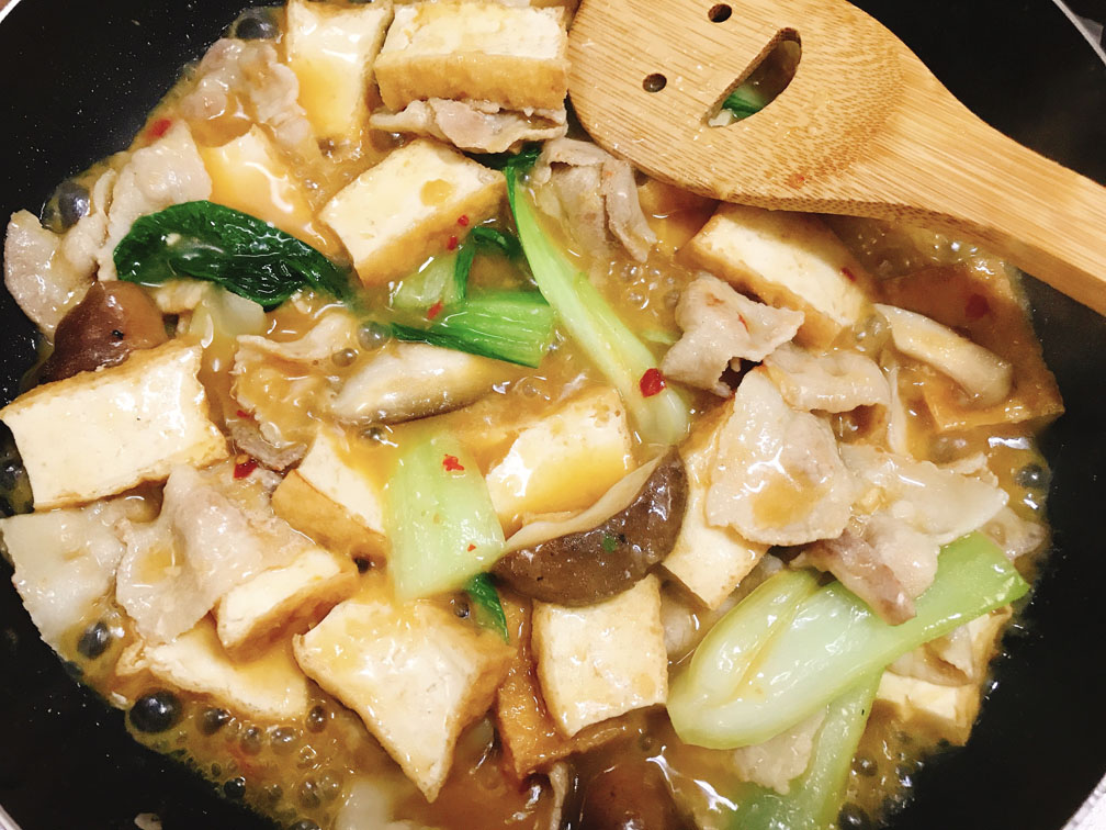 家常豆腐(ジャーチャンドウフ)という名称の、厚揚げと適当な肉野菜キノコを入れたピリ辛炒め煮料理です。