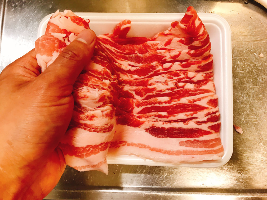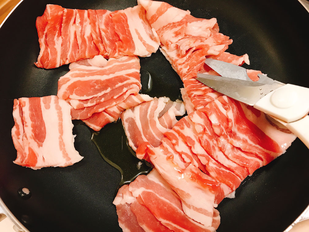 1、豚バラ肉をハサミで切ります