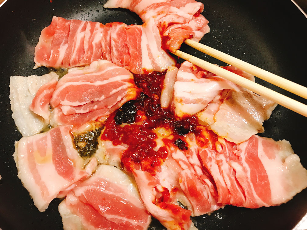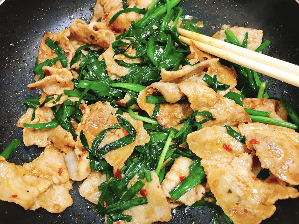 豚バラに火が通るまで少し時間がかかるため、最初からニラを入れると焦げてしまいます。