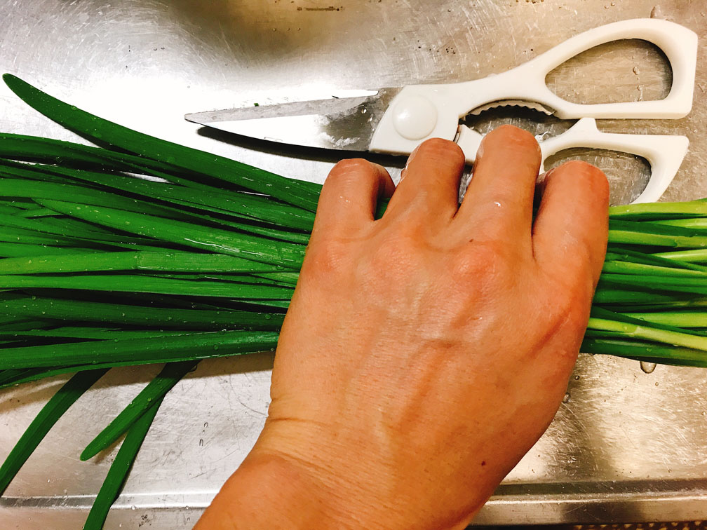3、ニラをハサミで切って入れます