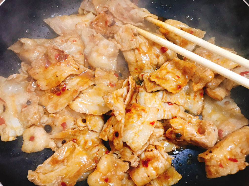 2、豚バラを炒めます