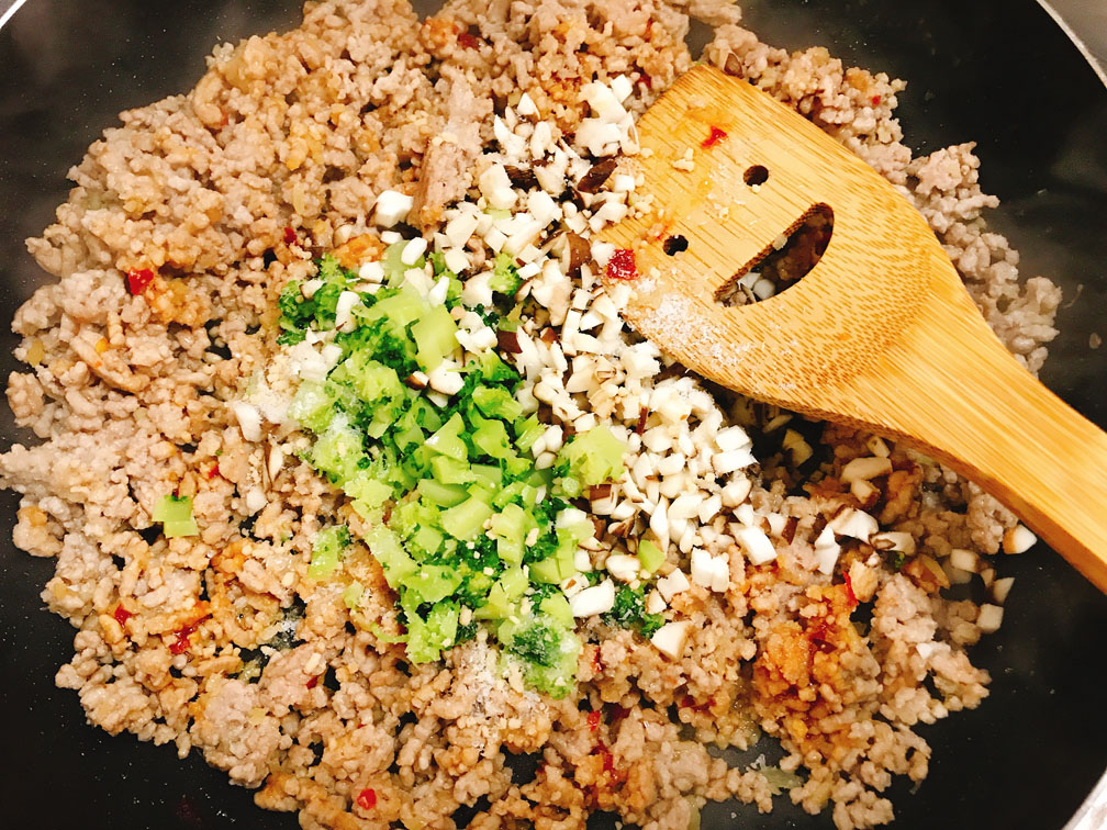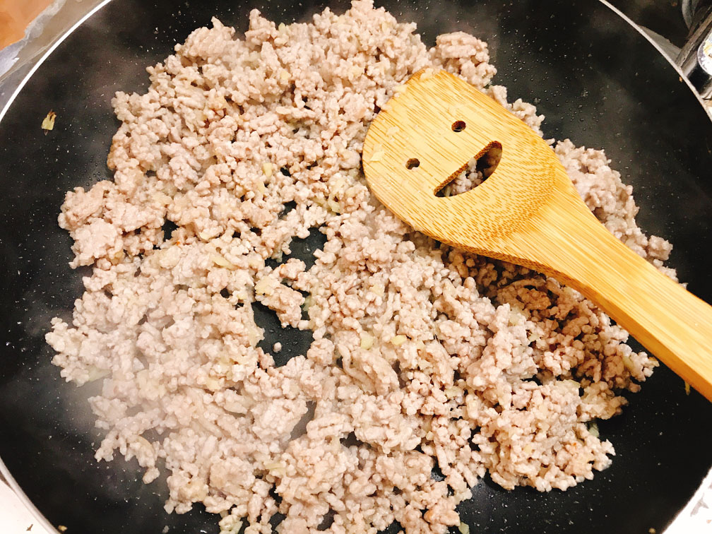 生姜と糖質0清酒を入れて炒めることで、豚ひき肉に臭みを完全に消しています。迷ったときは気持ち多めに入れても良いです。