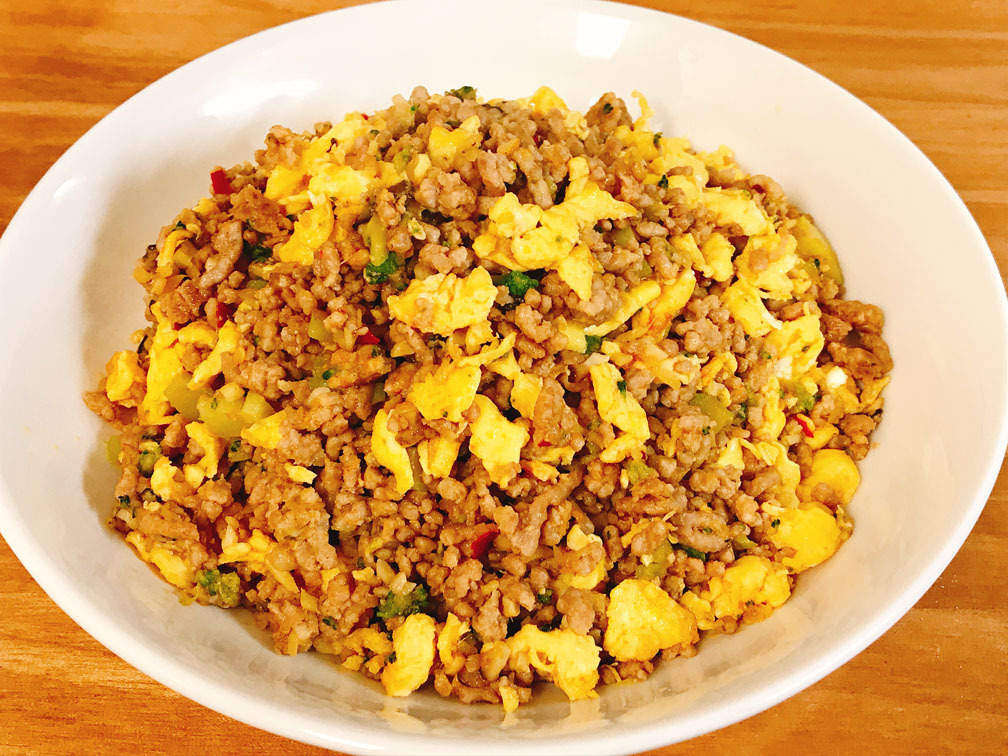 全部食べても糖質量はわずか4.23g、ご飯の代わりにひき肉を使用した超低糖質&高タンパク&高脂質の炒飯。