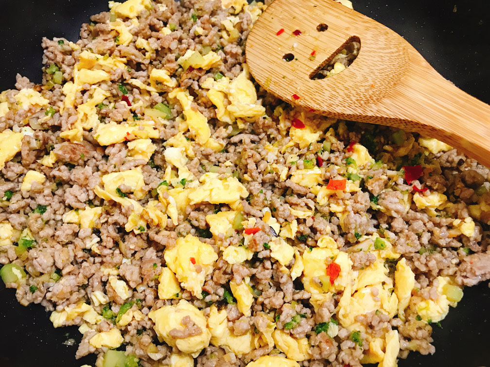 米飯を完全に排除し、たっぷりの挽き肉で作る低糖質炒飯は、簡単にできて栄養満点の一品です。