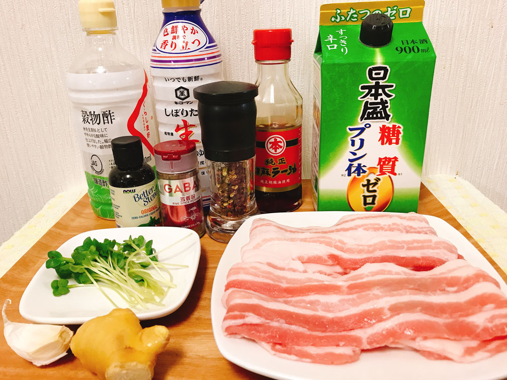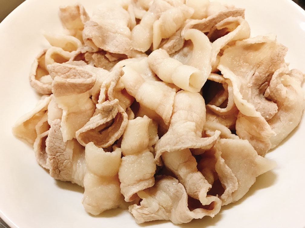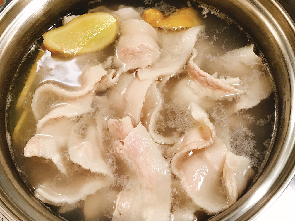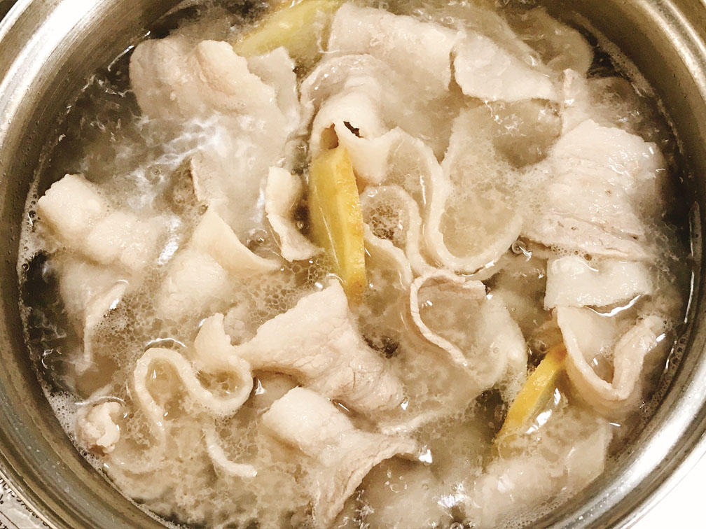 沸騰したお湯に生姜、糖質0清酒を入れて、豚肉を投入します。