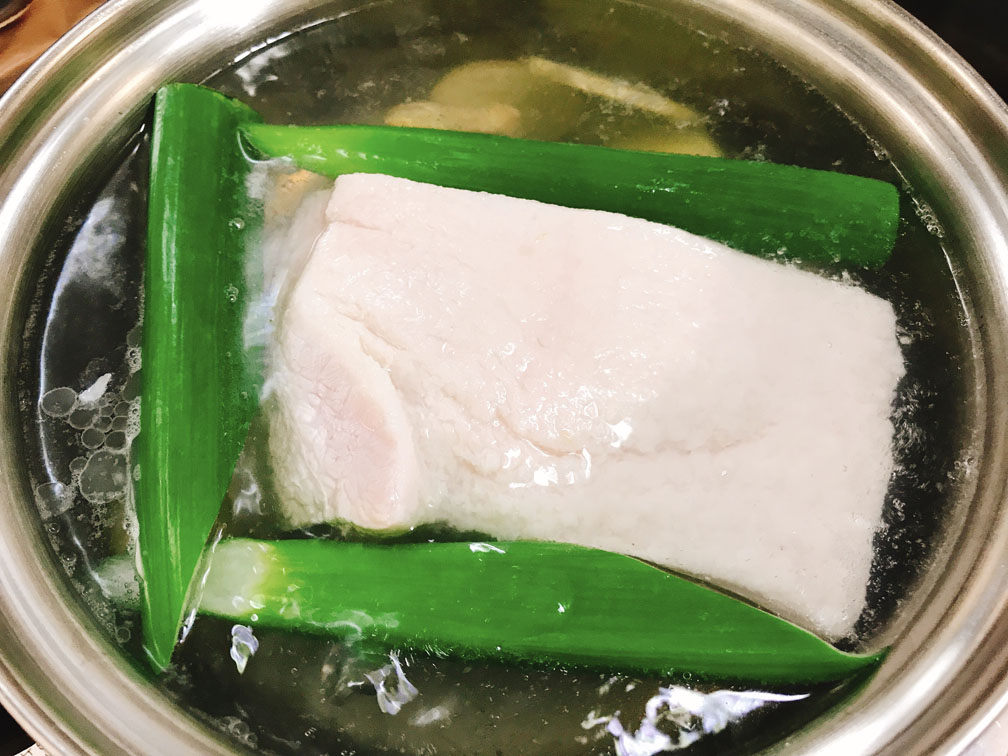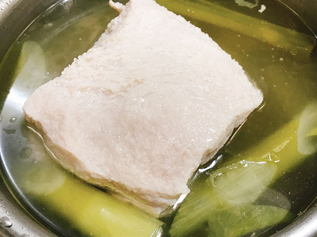 鍋にたっぷりのお湯を沸かし、糖質0清酒・ネギの青い部分・生姜スライスを入れて40分程度茹でます。
