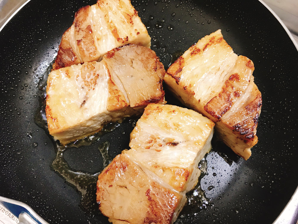 フライパンに調味料B(ごま油)を敷き、表面をこんがり焼きます。
