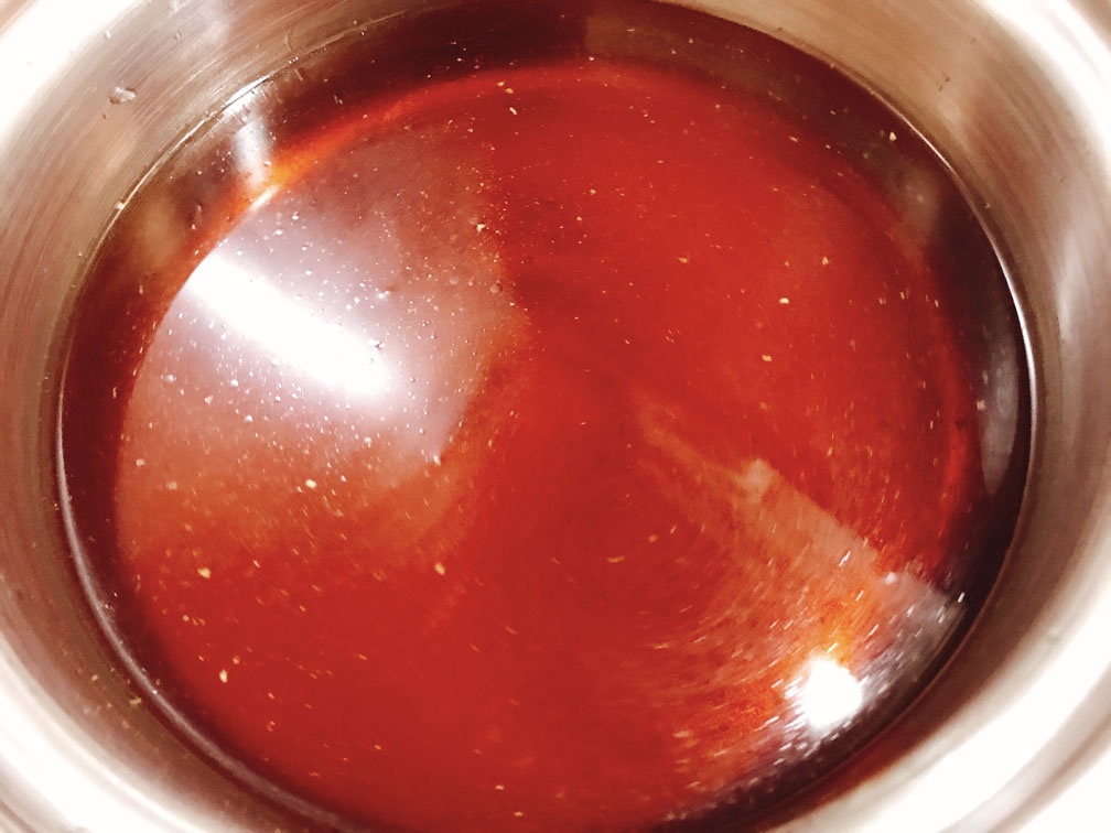 煮込みが完了したら肉をお皿に盛り付け、煮汁少々と共にグァーガムを入れて加熱し、トロミの付いたタレを用意します。