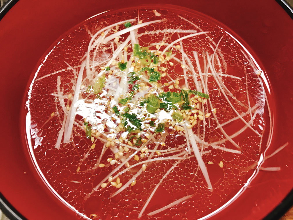 塩と味の素で調味し、ネギを浮かべたスープにしました。